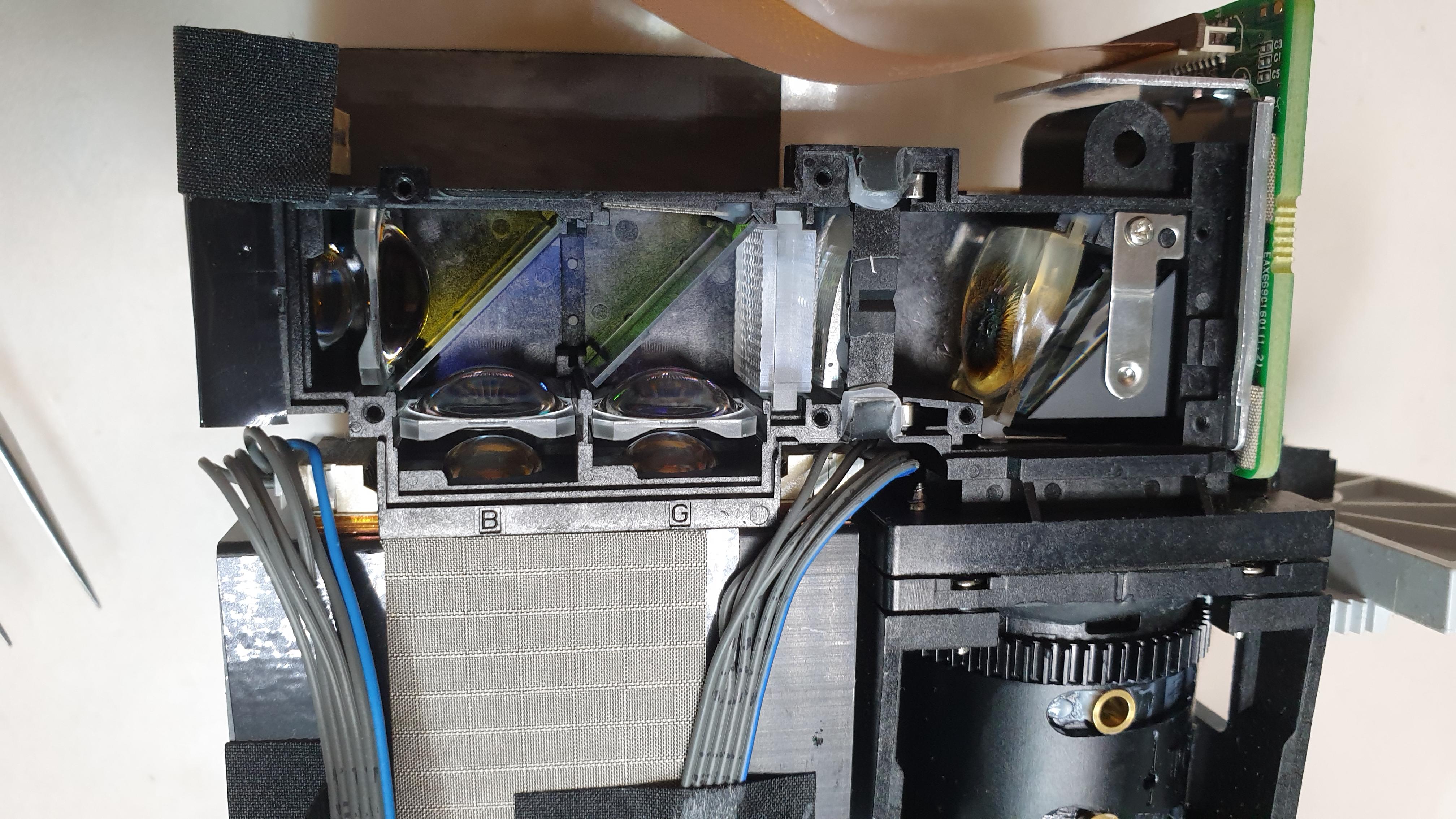 그로인하여 내부 다양한 부품이 고장을 초래할 수 있습니다. 위 모습은 광학엔진 속 렌즈가 까맣게 타버린 모습인데요. LG_PH55HT기종도 클리닝의 부재로 화면을 정상적으로 출력할 수 없었습니다.